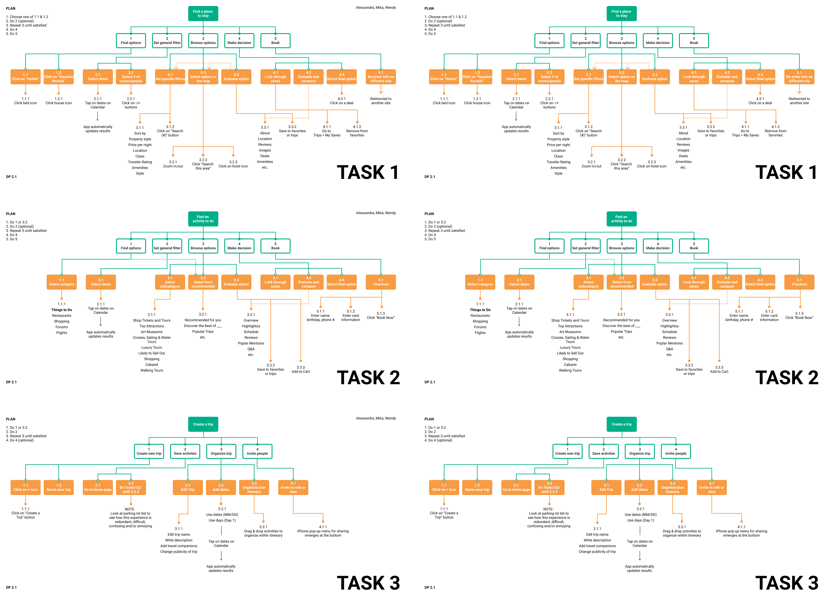 We continued our intitial user testing observations by organizing the usability processes for the 3 tasks (Finding a place to stay, Finding an activity to do, and Creating a trip) into task analysis flowcharts as shown below.