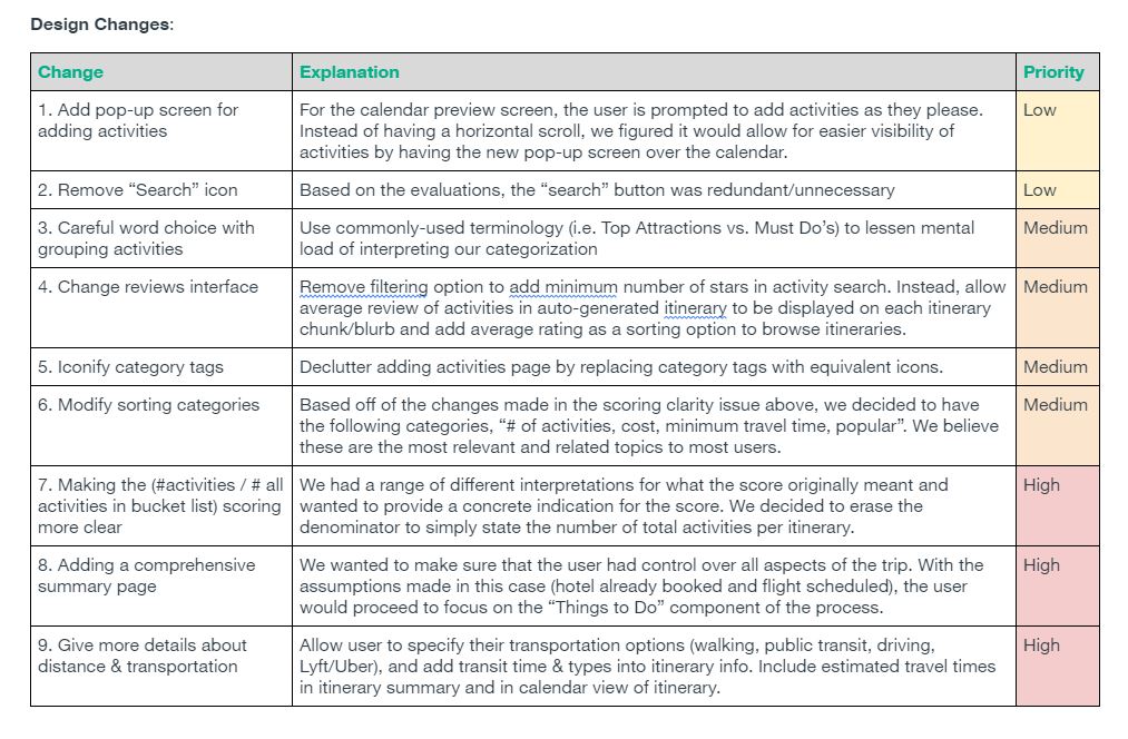 Previously, the 3 tasks we defined for TripAdvisor were: Finding a place to stay, Finding an activity to do, and Creating a trip. After comparing TripAdvisor to competitors such as Airbnb and Yelp, we learned that our first 2 tasks of finding lodging and activities follow similar processes. More specifically, these services allow users to filter search results, compare their top choices, make a final decision based on their personal preferences, and make a reservation. In contrast, creating a trip (in particular, planning a schedule/itinerary) was a more nuanced and complicated feature of TripAdvisor that frustrated both our team members and users when we tried to operate this task. In addition, we learned that one of the hardest parts of travel isn’t finding things to do, but rather planning each travel date such that a user can check off as items from their bucket list. We decided to narrow the scope of our project and define our system to the Creating an itinerary aspect of TripAdvisor. Since it was such a confusing feature to navigate within the app, we believe it has the most potential for improvement and creativity. The breakdown of this feature is listed in our 3 tasks below.