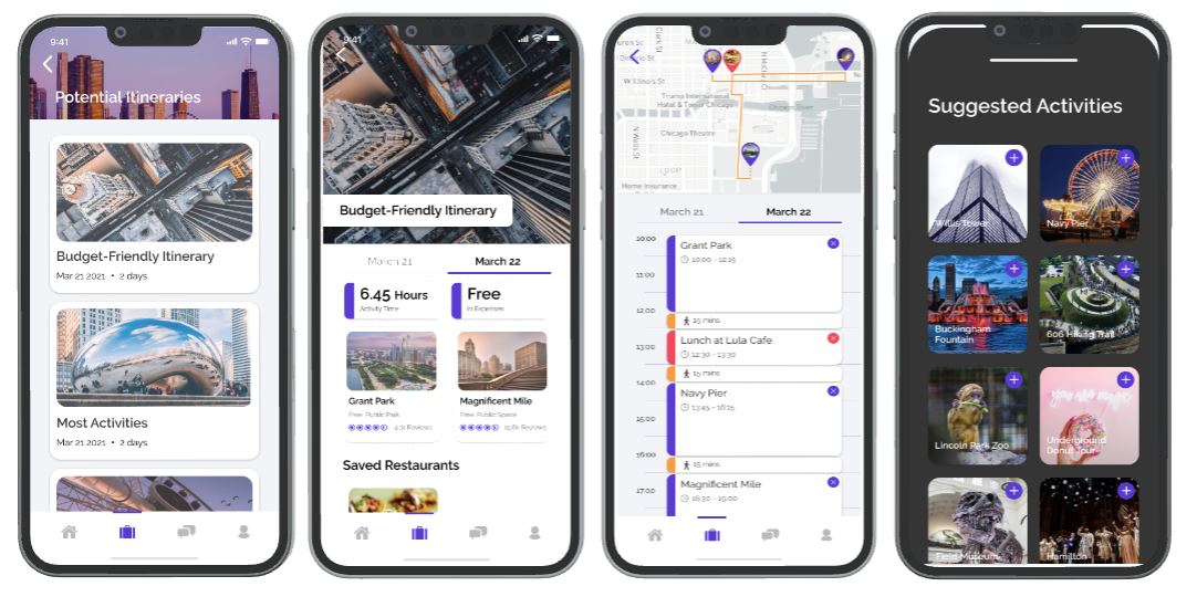 We decided to develop a product out more for Person B because based on the heuristic evaluations, our user wanted more control over logistics (i.e. designating time slots for activities) and optimizing time. We believe that users should be able to have more optimization features that are easily woven into the system, even if they do not desire to use all of the organizational features of the concept. Moving forward, we will incorporate some of the quick add or suggestions features of Concept A into Concept B. In this way, we can provide the organized, busy student with the tools to carefully and quickly plan their trip. From our initial stages and collective, we were able to create a fully functional Itinerary feature flow through wireframes on Figma as shown below.